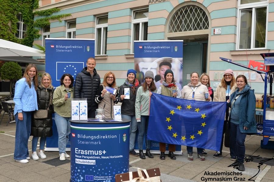 Am 09. Mai 1950 verkündete der französische Außenminister Robert Schuman seine Idee der Zusammenarbeit in den Bereichen Kohle und Stahl mit Deutschland und weiteren Staaten, um nach zwei verheerenden Weltkriegen und jahrhundertelangen Feindschaften endlich dauerhaften Frieden in Europa zu schaffen. Daher feiert die Europäische Union diesen Tag als Europatag. Heuer jährt sich dieser Tag zum 75. mal – gleichzeitig jährt sich der Beitritt Österreichs zur Europäischen Union zum 30. mal. Aus diesem Anlass organisierte Europe Direct Steiermark gemeinsam mit LOGO! Jugendmanagement, Panthersie für Europa, dem Land Steiermark sowie der Bildungsdirektion Steiermark, ein Europafest am Platz vor unserer Schule. Zahlreiche Klassen nahmen daran teil und erfuhren wichtige Informationen zum Friedensprojekt EU. Unsere EPAS-Junior Botschafterinnen nutzten die Gelegenheit, um Passant:innen zu kurzen Interviews zu bitten. Die Interviews werden zu einem späteren Zeitpunkt online zu sehen sein.
