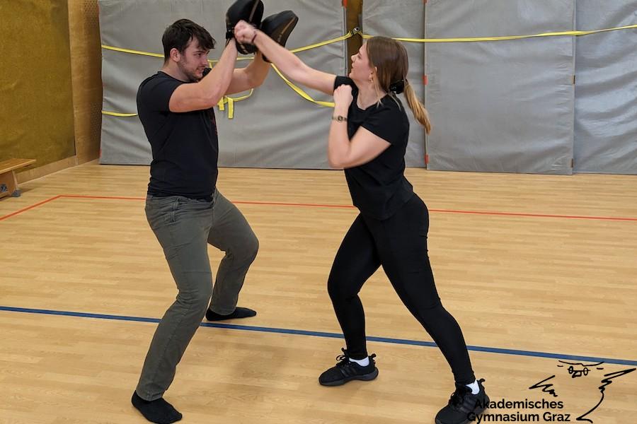 Nicht nur, aber gerade auch für Mädchen und junge Frauen ist es wichtig, die eigenen Grenzen kennen zu lernen, einzufordern und nötigenfalls auch verteidigen zu können. Zu diesem Zweck haben wir das Team der Adventure Leibnitz & Austrian Masters Academy unter MMag. David Duncan eingeladen, mit unseren Mädels der 5., 6. und 7. Klassen einen Selbstverteidigungskurs über je fünf Einheiten abzuhalten. Die erste Einheit dazu fand am 13.1. 2023 mit der 7ab statt und war bereits ein voller Erfolg. So lernten die Mädchen in der ersten Stunde ihre persönliche „Wohlfühlzone“ kennen, setzten erst ihre Stimmen und dann auch ihren Körper zur Abschreckung und Verteidigung ein und waren überrascht über die eigene Kraft, die hier verborgen liegt.