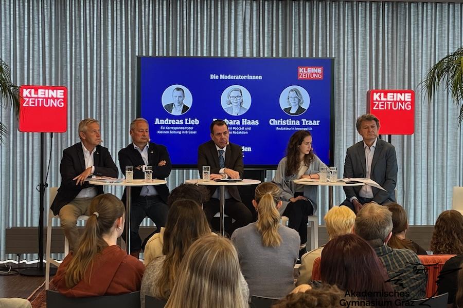Am 14.05.2024 durfte die 7b zu Gast bei der Kleinen Zeitung im Styria Media Tower sein. Dort fanden sich fünf Spitzenkandidat:innen zur Europawahl (am Foto von links nach rechts: Reinhold Lopatka – ÖVP, Andreas Schieder – SPÖ, Harald Vilimsky – FPÖ, Lena Schilling – Grüne, Helmut Brandstätter – NEOS) ein, um über Umwelt, Migration, die Zukunft Europas und andere brisante Themen zu diskutieren und sich auch den kritischen Fragen der Schüler:innen zu stellen. Es war spannend zu sehen, wie weit die politischen Ansichten teilweise auseinander liegen und wie durchaus hitzig manche Themen diskutiert wurden. Wir bedanken uns bei der Kleinen Zeitung und selbstverständlich bei allen Spitzenkandidat:innen für diesen spannenden Vormittag!