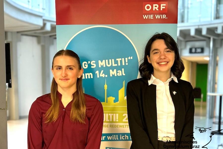Am Dienstag, dem 25. April 2023, fand die „SAG’S MULTI!“-Finalrunde für Steiermark und Kärnten im Landesstudio Steiermark in Graz statt. Unsere Schule wurde dabei bravourös von zwei Finalistinnen vertreten: Hanna Brcic und Mattea Hansis (beide aus der 5b).