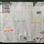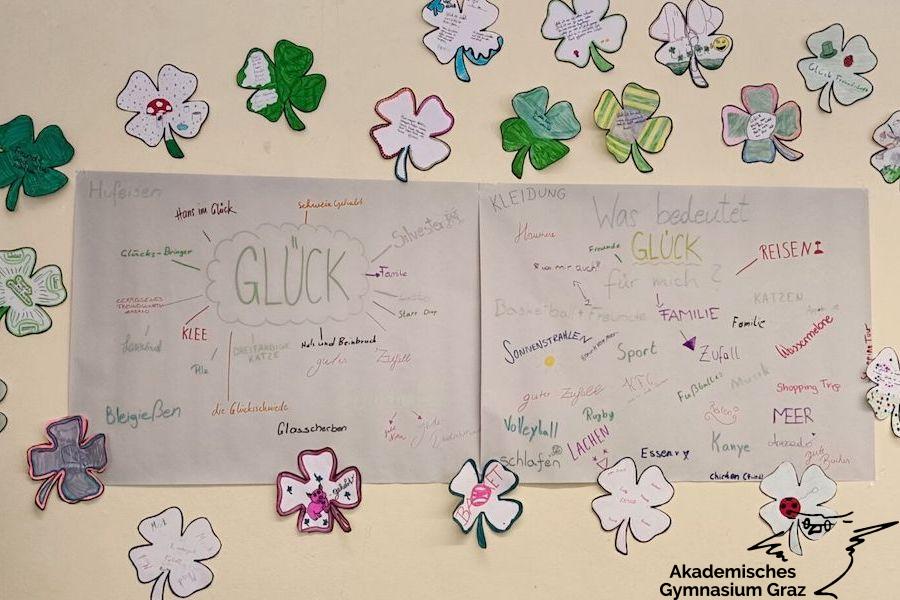 In einer dritten Klasse wurden im Rahmen des Deutschunterrichts zwei Plakate aufgehängt – die eine als Mindmap zum Thema „Glück“, die andere zur Auseinandersetzung mit dem persönlichen Glück. Die Schüler:innen haben alles, was ihnen dazu eingefallen ist auf den Plakaten notiert. Im Anschluss hat jede:r ein Kleeblatt bekommen, das ganz individuell gestaltet werden durfte – beispielsweise mit Wünschen, Sprüchen, Gedichten oder Zeichnungen.