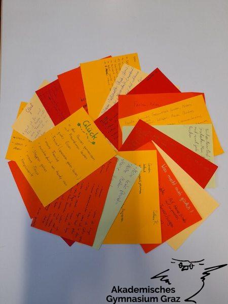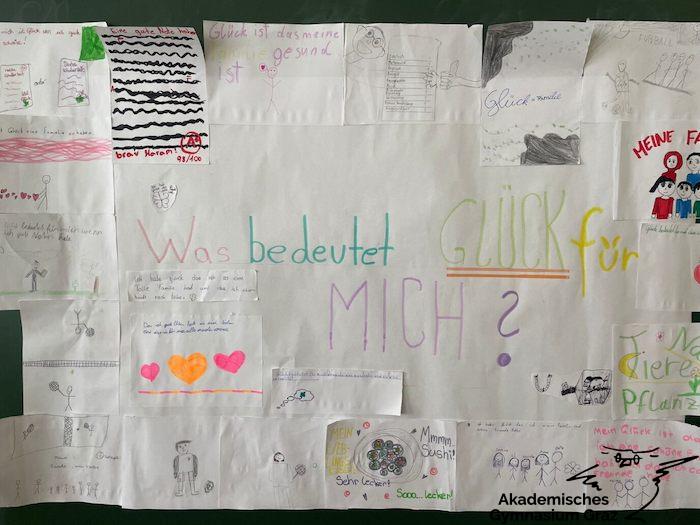 Die Schüler:innen einer siebten Klasse haben im Rahmen des Deutschunterrichts das Märchen „Hans im Glück“ gelesen und danach über die Glücks-Definition in der Geschichte gesprochen. Im Anschluss ist eine Diskussion zur Frage „Was ist Glück“ entstanden.